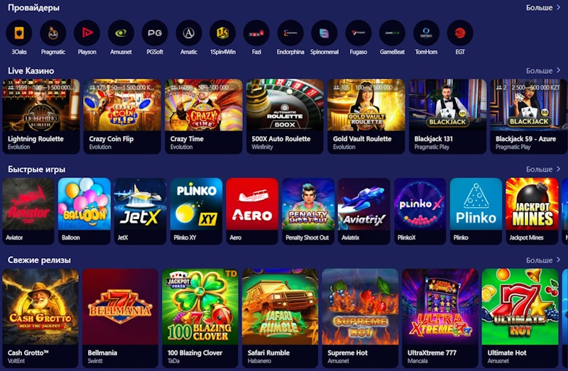 Главная страница открывается яркими баннерами с актуальными предложениями, а ниже расположен каталог игр. Здесь можно найти популярные слоты с высоким RTP, новые релизы от ведущих провайдеров, а также карточные и настольные развлечения. Для любителей атмосферы настоящего казино работает раздел с живыми дилерами.