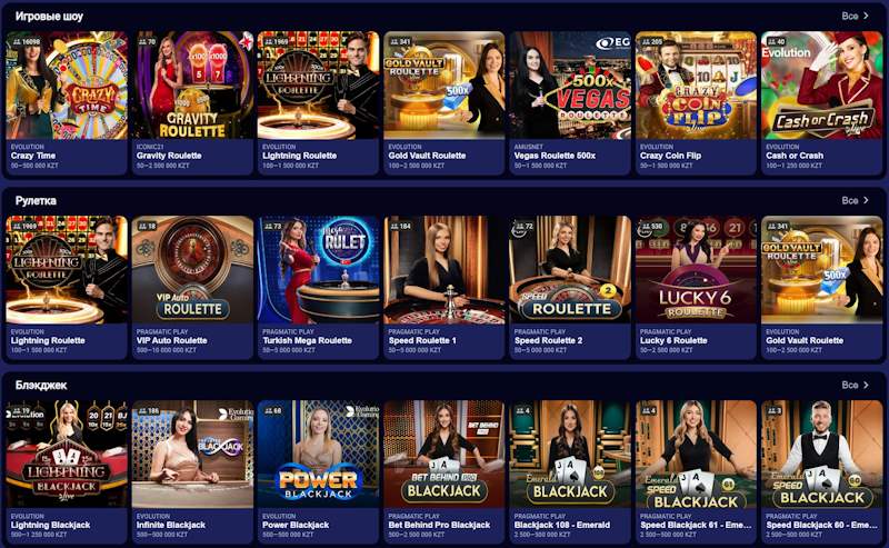Помимо слотов, в казино представлен обширный выбор настольных игр: покер, блэкджек, рулетка и баккара. Для тех, кто ценит атмосферу реального казино, доступен раздел live-игр, где ставки принимают настоящие дилеры в режиме онлайн.
